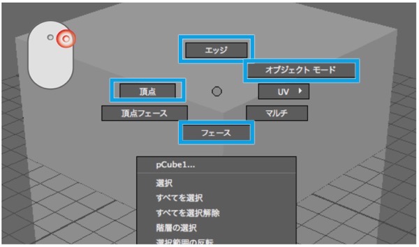 オブジェクトとコンポーネントの選択モードを切り替えるには、オブジェクトにマウスカーソルが重なった状態で右ボタンプレスします。