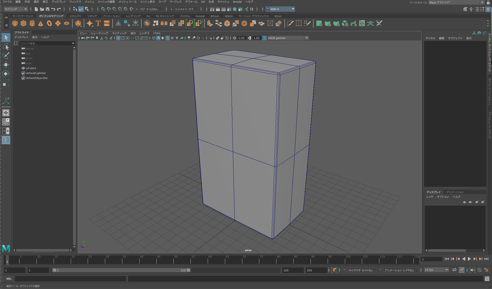 立方体オブジェクトを作成する段階で軸の分割を2にしておくのが近道ですが、分割を追加しながら進めるのがポリゴンモデリングですので、敢えて遠回りしています。