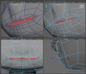さらに、左上画面のperspビューはワイヤーフレーム表示にします。 こうすると画面を図のようにタンブルして口の裏側から見たときに他の顔のポリゴンが確認しやすくなります。