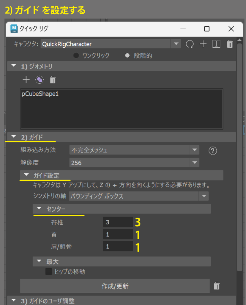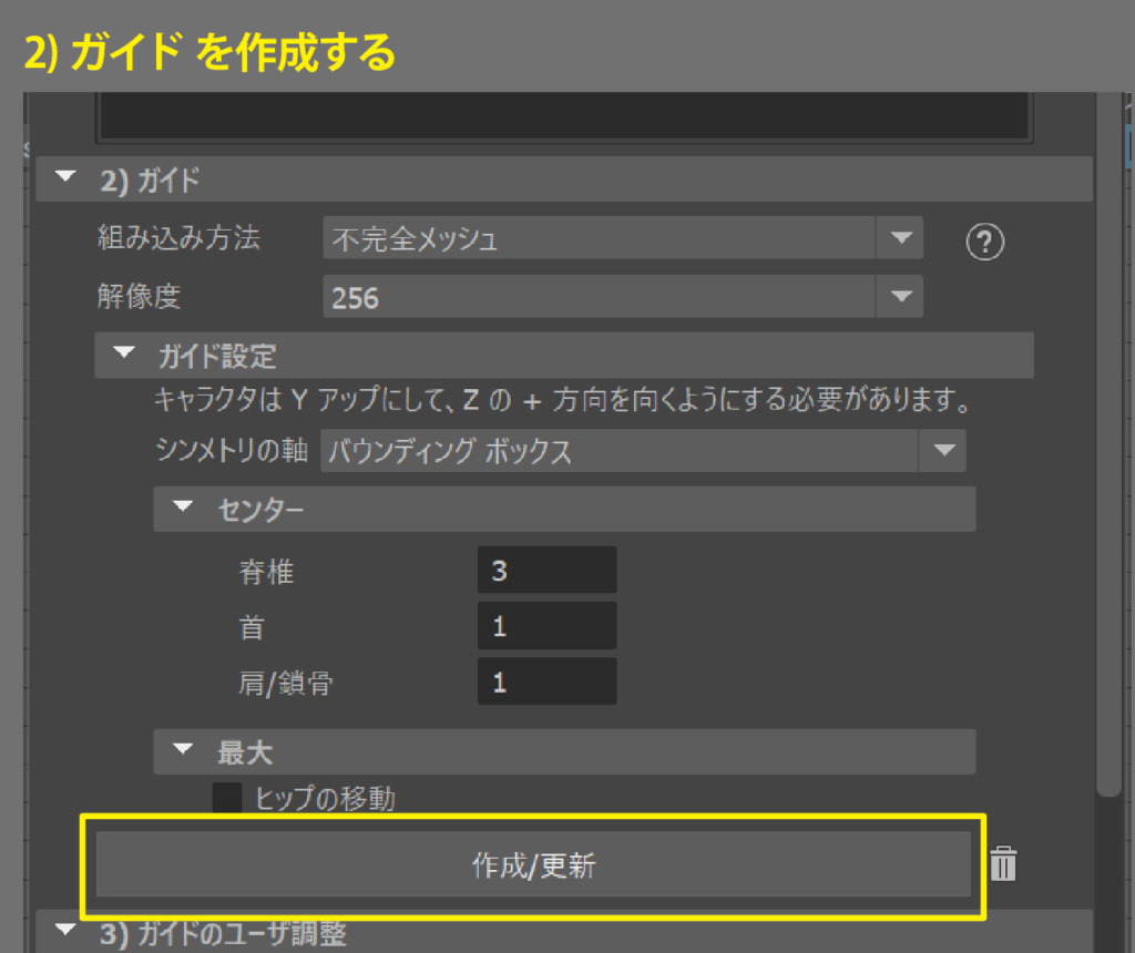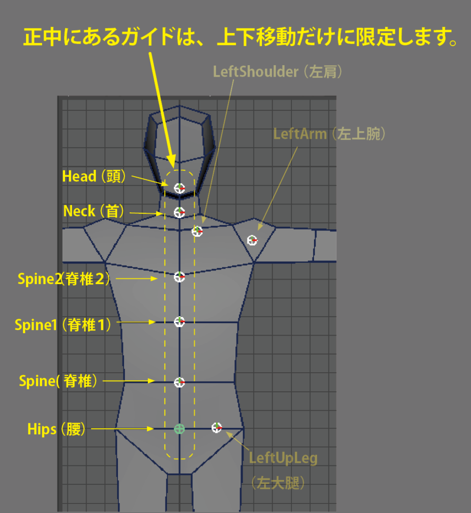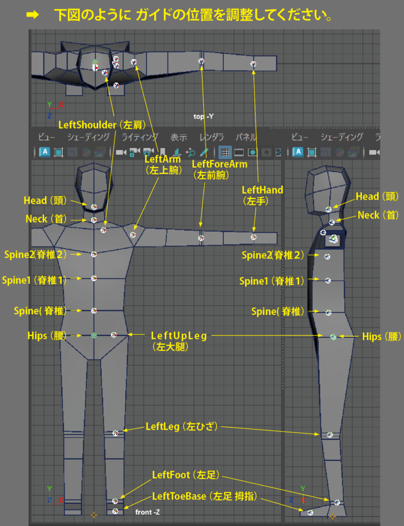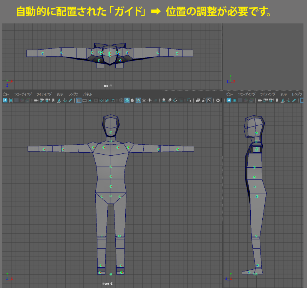 ガイド」とはMayaで「ジョイント」と呼んでいる骨格(スケルトン)の位置を決めるための印です。作成したあとで関節の位置へ移動する必要があります。