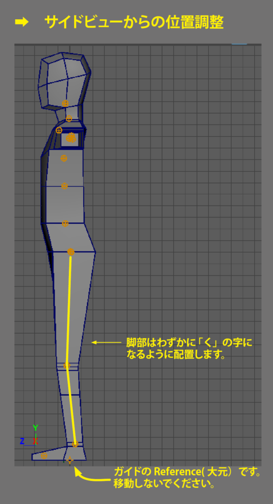 この操作は、リギングの結果に大きく影響するので、かなり重要です。 それぞれのガイドがどこの関節になるかを理解した上で位置調整していきます。