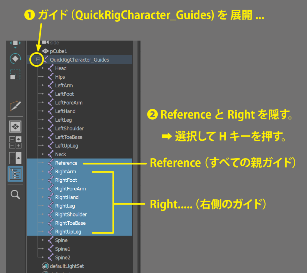 全ての 親[ Reference ] 右側[ Right ]のガイドをアウトライナで選択し、Hキーを押して隠してください。 サイドビューから見たときは、左右が分からないため混乱するのを防げます。