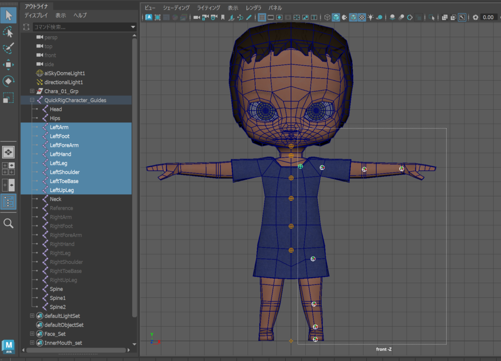「QuickRigCharactar…Guide」「+」をクリックして展開、中のガイド名をよく確認してください。 リギングではリグやジョイント(ガイド)の名前が重要になります。 左右対になっているものは、キャラクターから見てどちら側なのか判断がつくように [ Left ] または [ Right ]と表記しています。 慣習として向かって右側、キャラクタから見て左側 [ Left ] のジョイントを先に編集し、あとでまとめて[ Right ] 側にミラーコピーします。
