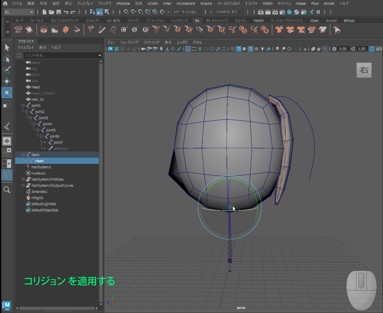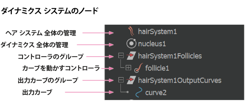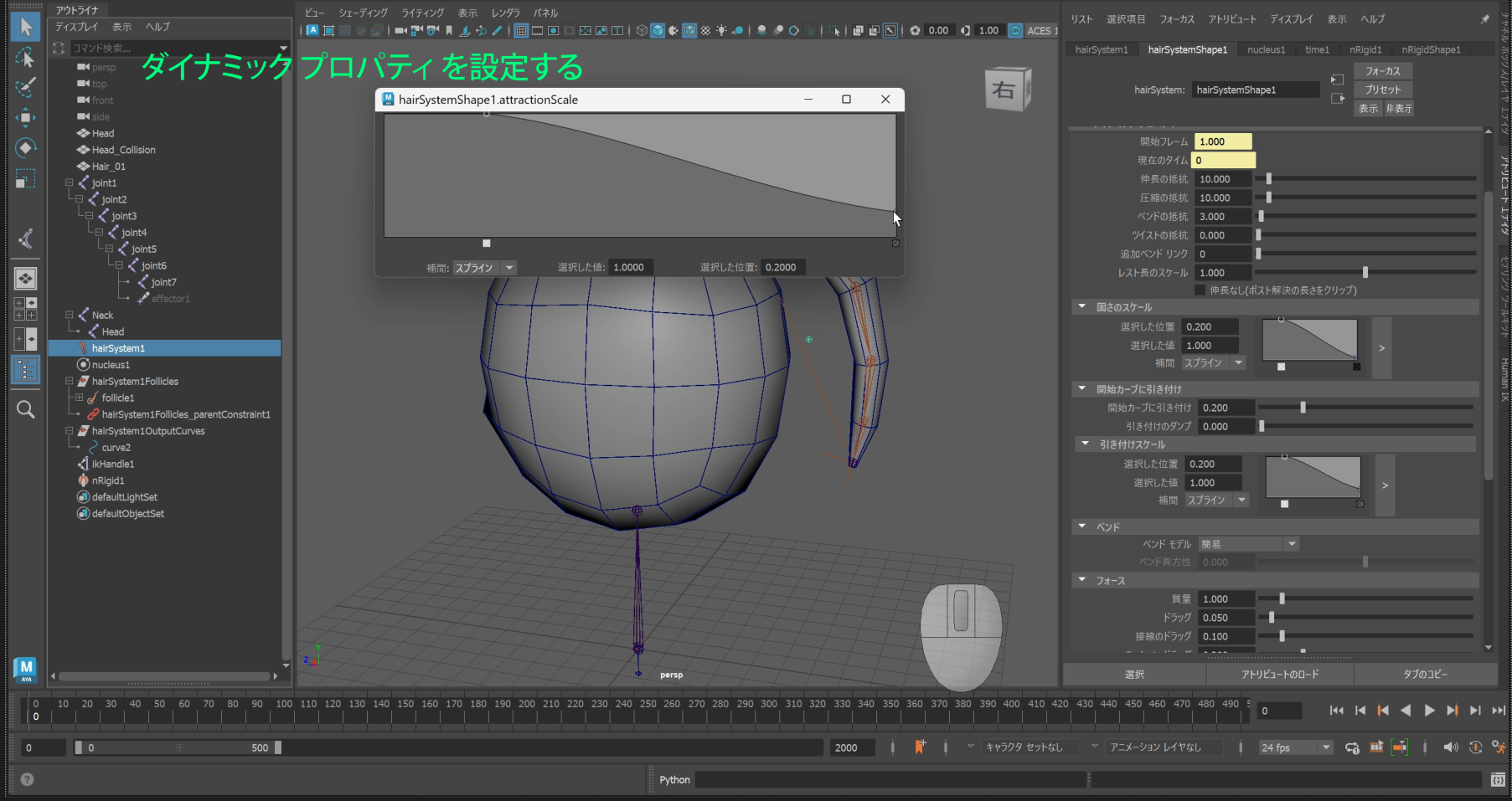 これでヘア ダイナミックシステムは完成ですが、次はヘアシステムをキャラクターのHeadジョイントから接続して頭の動きに同期させます。