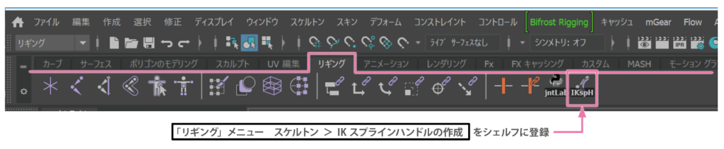 「IKスプラインハンドルの作成」は、デフォルトではリギングのメニューからの選択になるので、リギングのシェルフに登録しておくと良いでしょう。