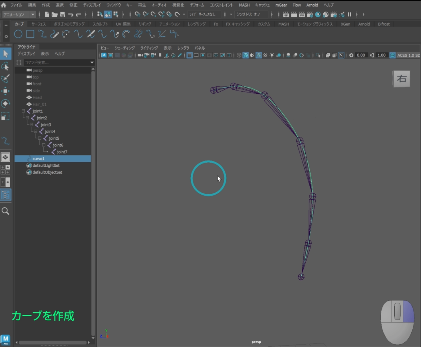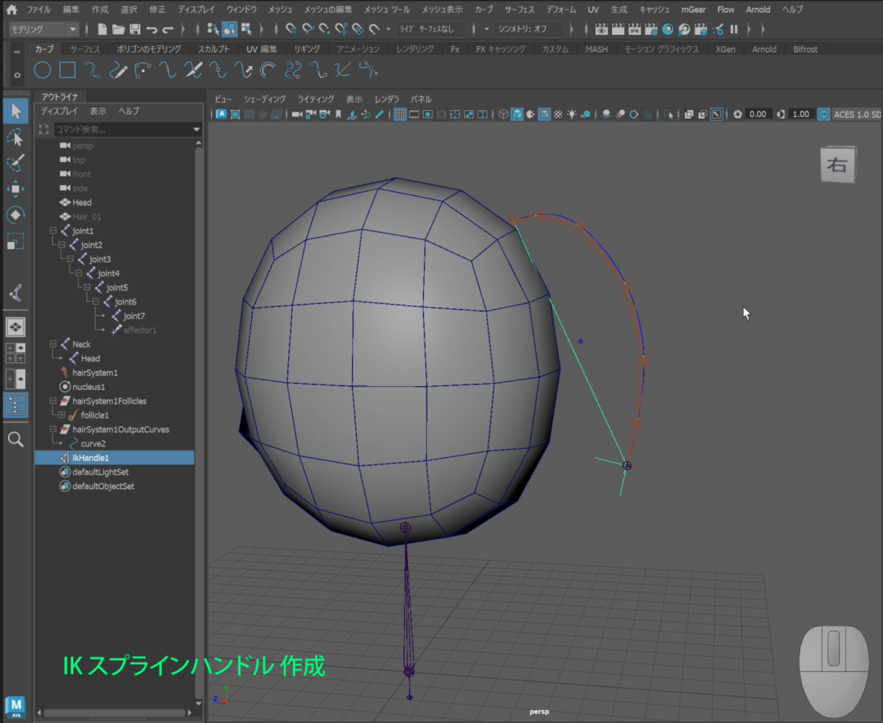 やることは、①IKスプライン ハンドル ツールを選択、②根本ジョイント → 末端ジョイント → hairSystemOutputCurvesの[curve] の順で選択するだけですが、繰り返し作業が多いのでジョイントと対応するカーブを間違えないように注意が必要です。