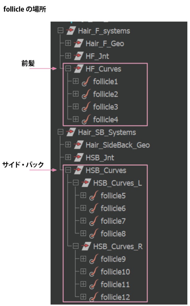 髪の長さ・部位ごとに整理しておくことで、「hairSystemShape」の「ダイナミックプロパティ」の設定値をまとめて変更できるようになり、ミスなく作業も早く進みます。