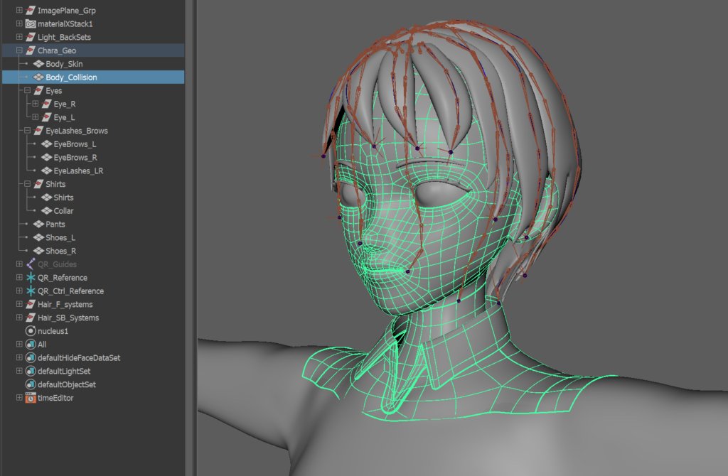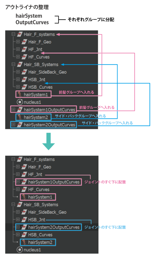 特に[ hairSystemOutputCurves ]のグループは、ジョイントと同時に選択するので、ジョイントグループのすぐ下に配置しておくと選択しやすくなります。
