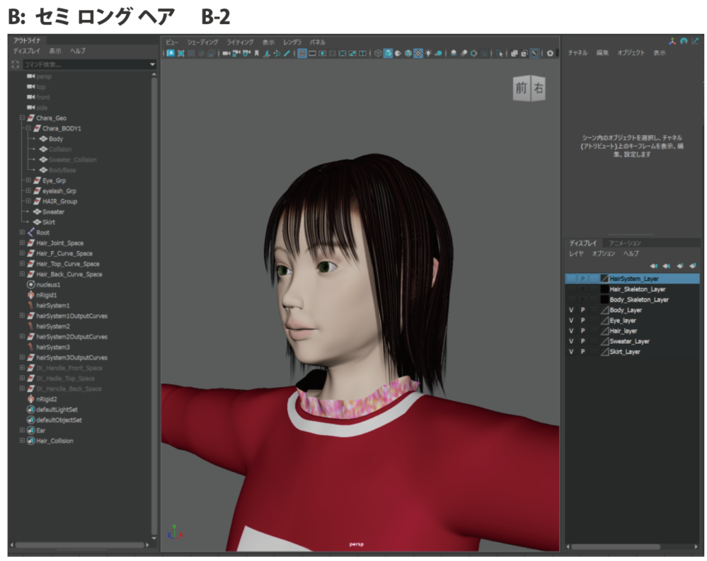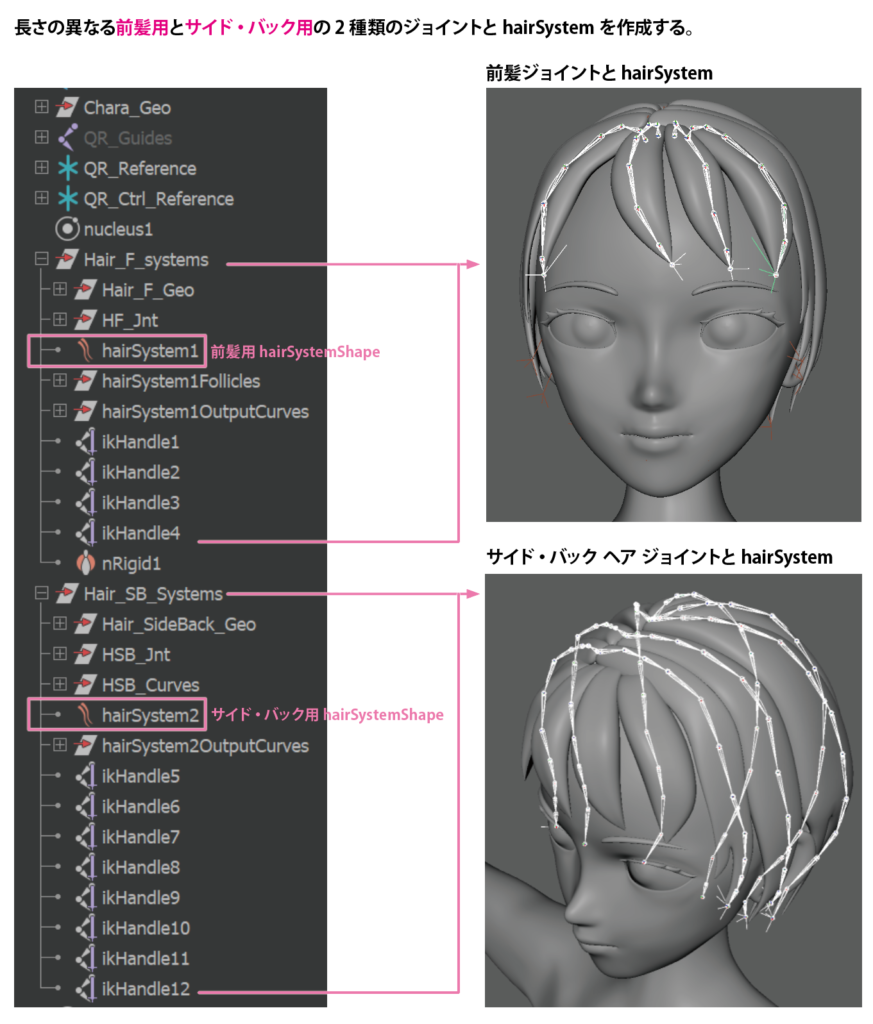 ヘア ダイナミクスを実際にキャラクターに設定する場合の留意点は、髪のメッシュオブジェクトとジョイントおよびダイナミクスに必要な要素を髪の長さと部位に応じて分けておくことです。