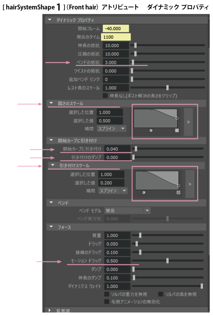 前髪のカーブ、サイド・バック ヘアのカーブ、それぞれ別々にnHairダイナミクスをつくります。