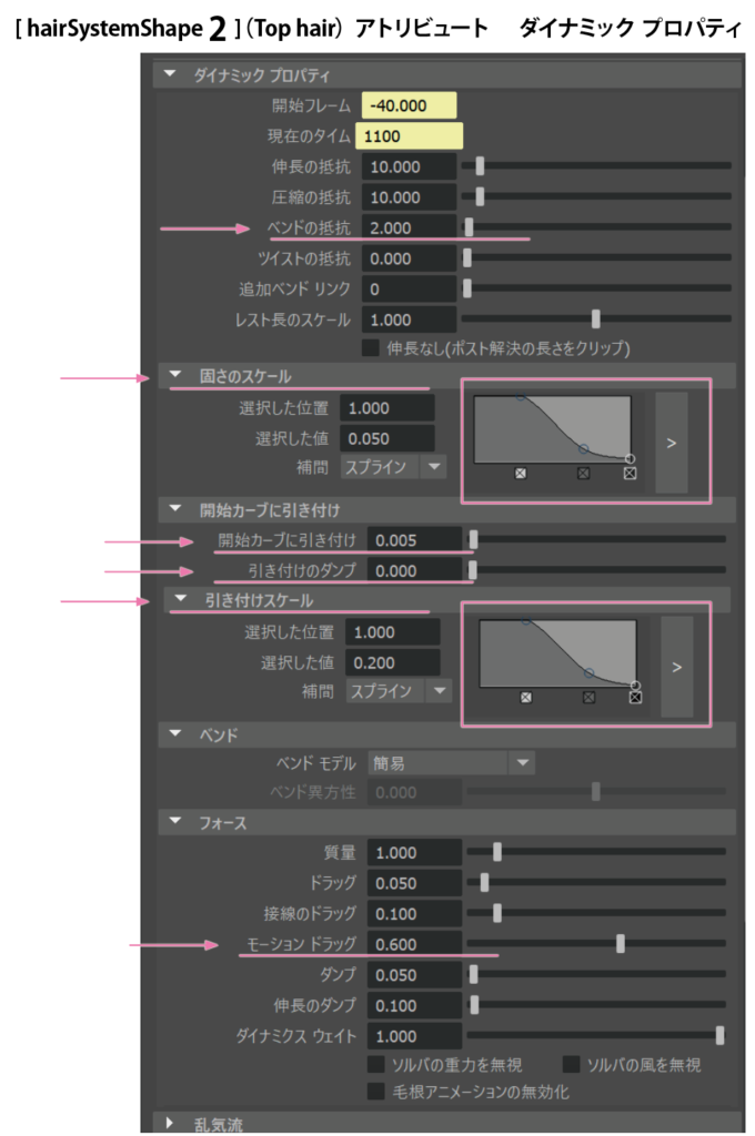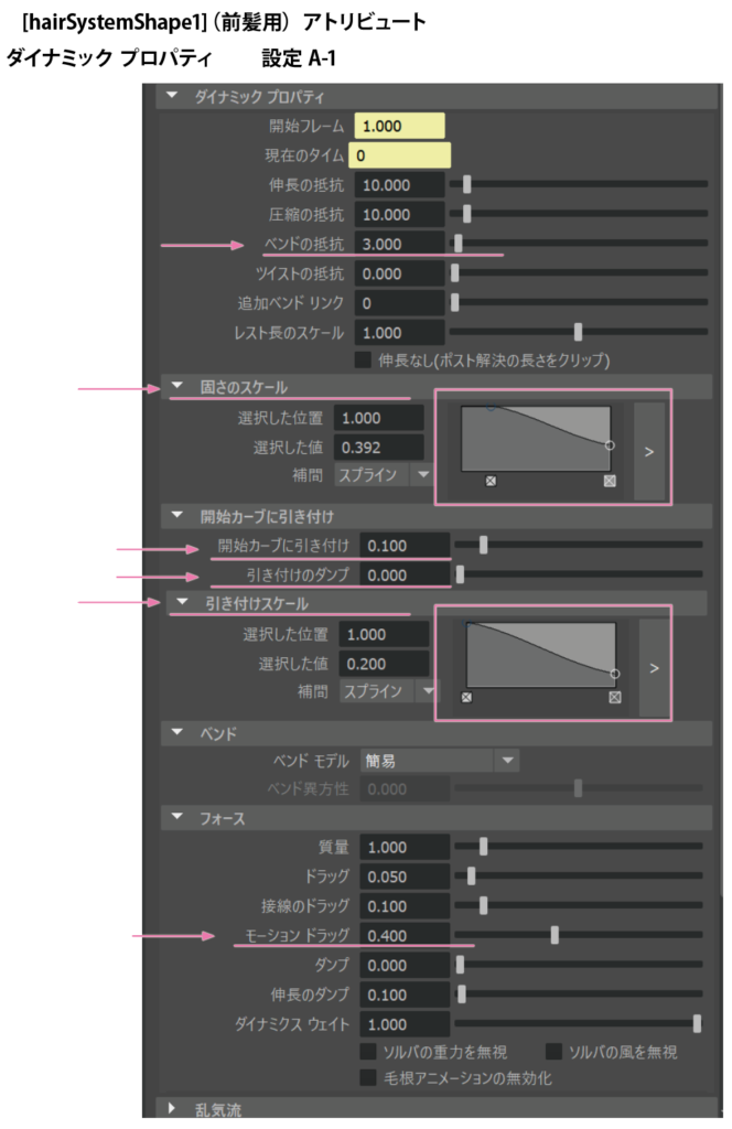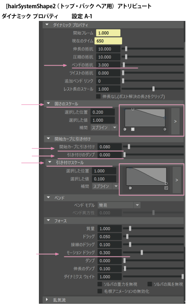 前髪用とトップ・バック ヘア用の2つのhairSystemShapeノードで、それぞれのダイナミックプロパティを下記のように調整しました。