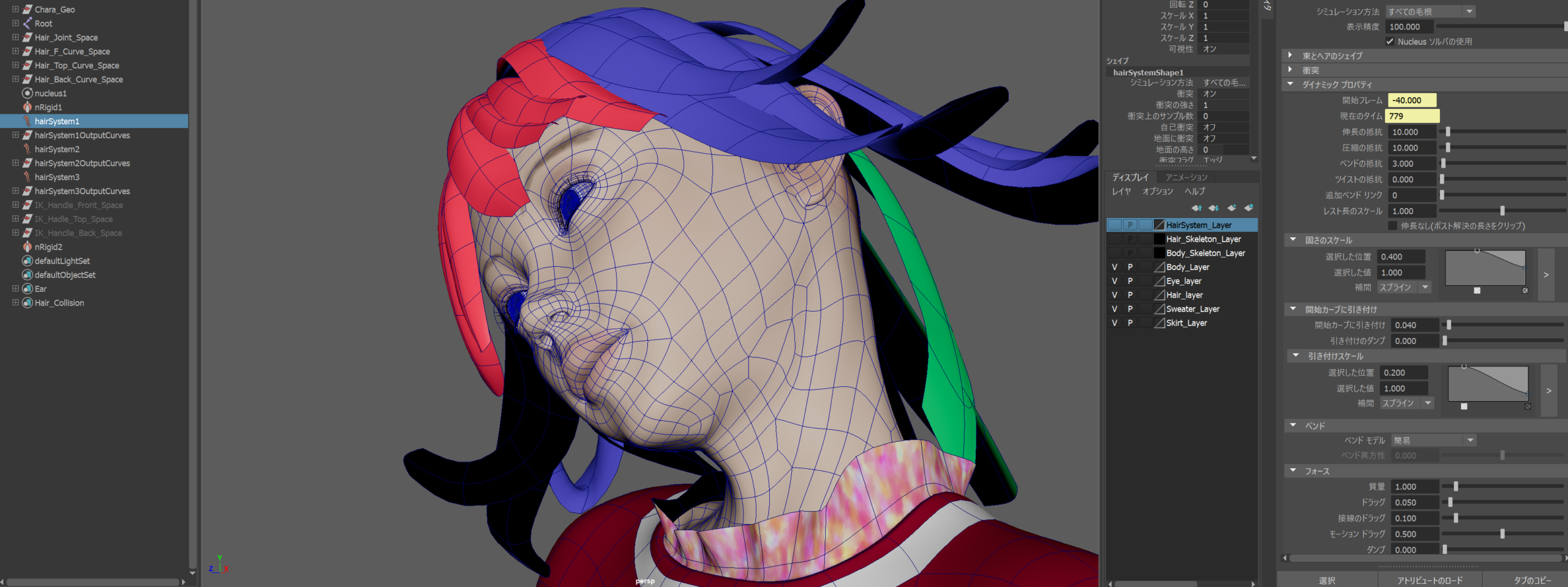 前回の「Maya nHairで髪を揺らす-1」で、nHairのダイナミクスを使ったポリゴンメッシュの髪を揺らすための基本操作を掲載しましたが、今回は実際にキャラクターに設定するときの操作と留意点を書きます。