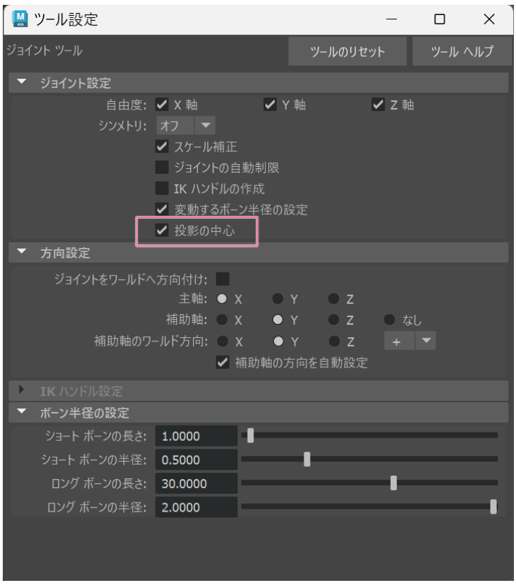「リギングメニュー」で、スケルトン > ジョイントの方向付け□(オプション)を選択し、「ジョイントの方向付け」オプションを表示します。