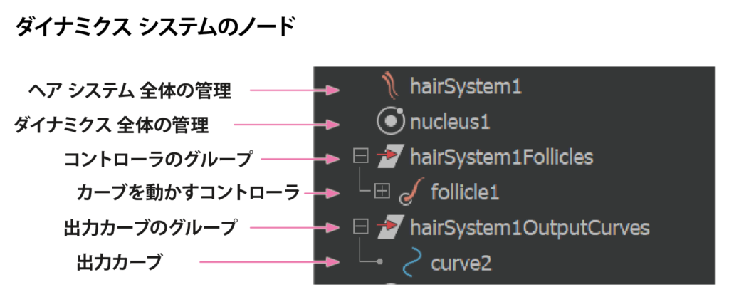 一番上の hairSystem1 が重要です。 hairSystem1のアトリビュートで「▼ ダイナミック プロパティ」を設定することで、すべてのfollicle [(毛根)= 出力カーブのコントローラ ]の固さや元に戻ろうとする力などの物理的振る舞いを制御できます。