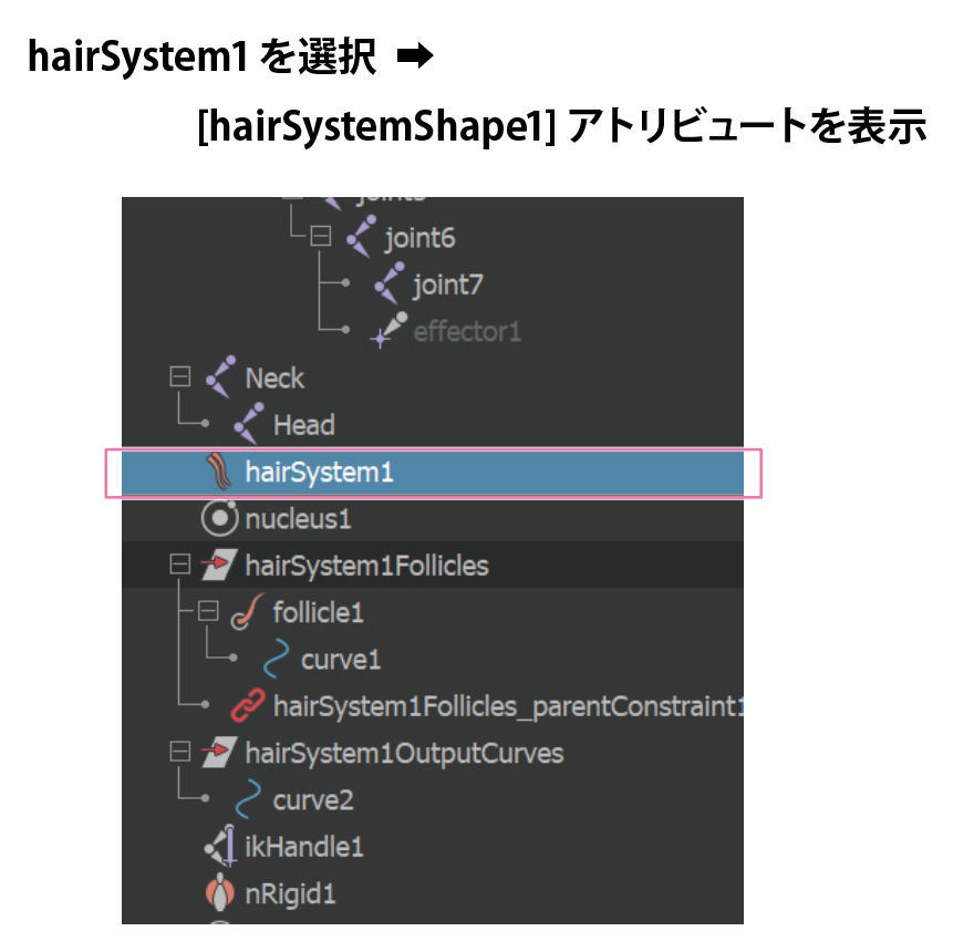 アウトライナで「hairSystem1」を選択し、アトリビュートエディタで、「hairSystemShape1」ノードを表示します。