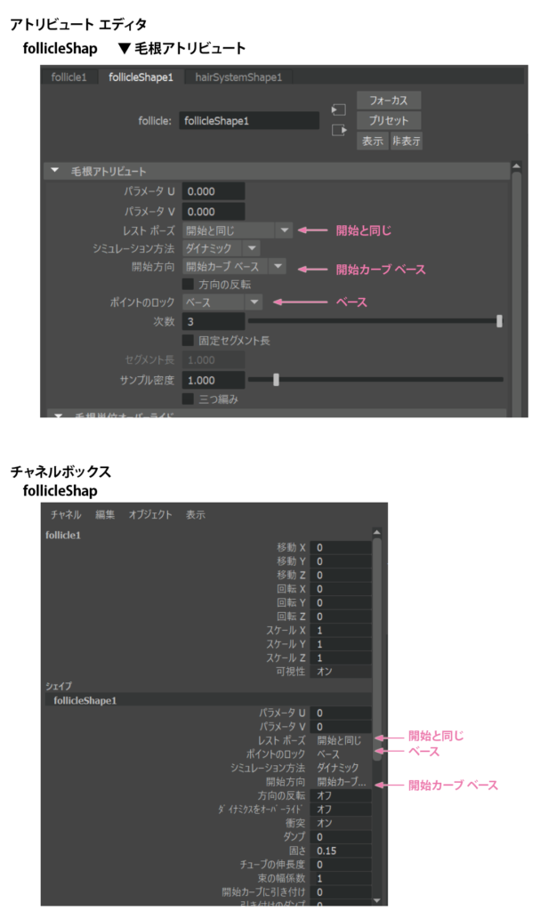 以上が、「hairSystemShapeのダイナミック プロパティ」の主な設定項目の比較になります。