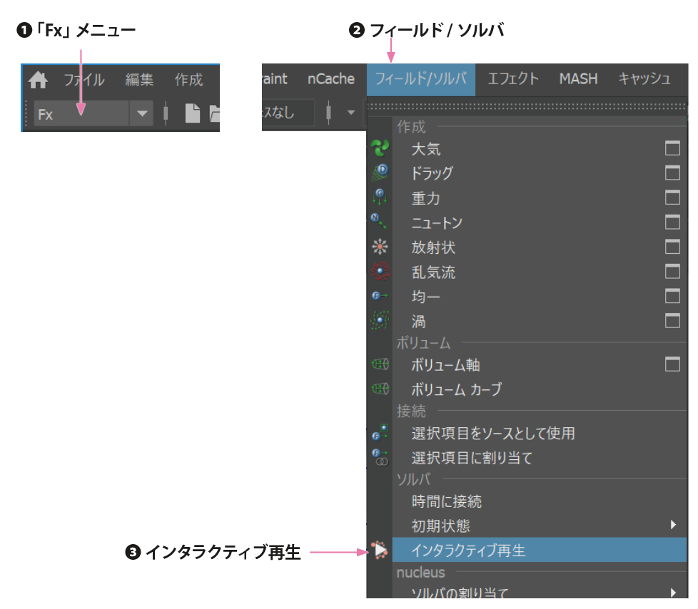 バージョンによってはボタンが登録されていないこともあります。その場合は、「Fx」メニューに切り替え、shift + Ctrl キー(Macは、shift + commandキー)を押しながら「フィールド/ソルバ」> 「インタラクティブ再生」を選んでシェルフに登録しておきます。
