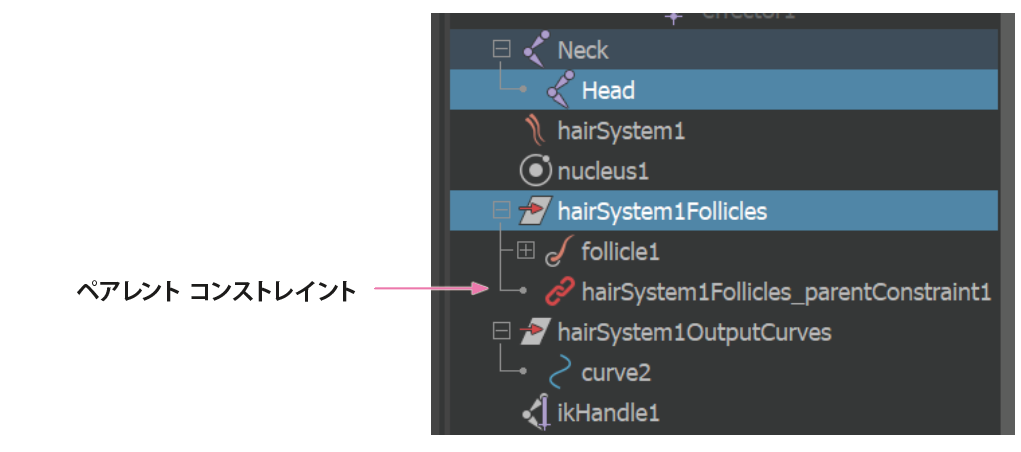 hairSystem11Folliclesが、Headジョイントからのペアレント コンストレイントによって動くようになります。