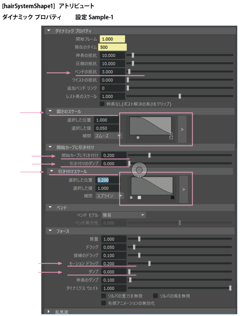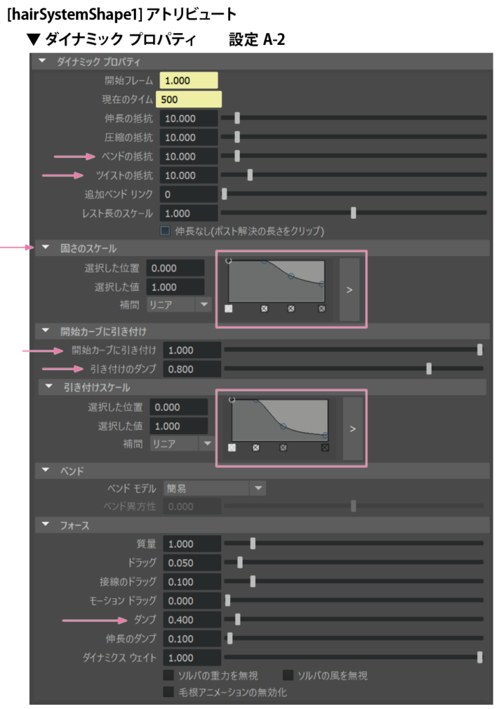 「hairSystemShape」の 「ダイナミックプロパティ」の下記矢印の項目を図のように変更します。