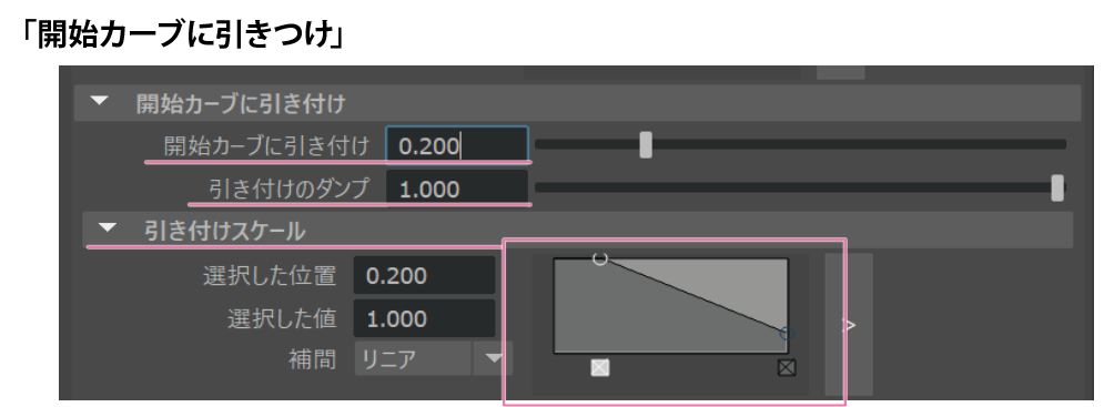 「開始カーブに引きつけ」に値を入れたときの、元の形に戻ろうとする力をダンプ(間引く・削減する)します。