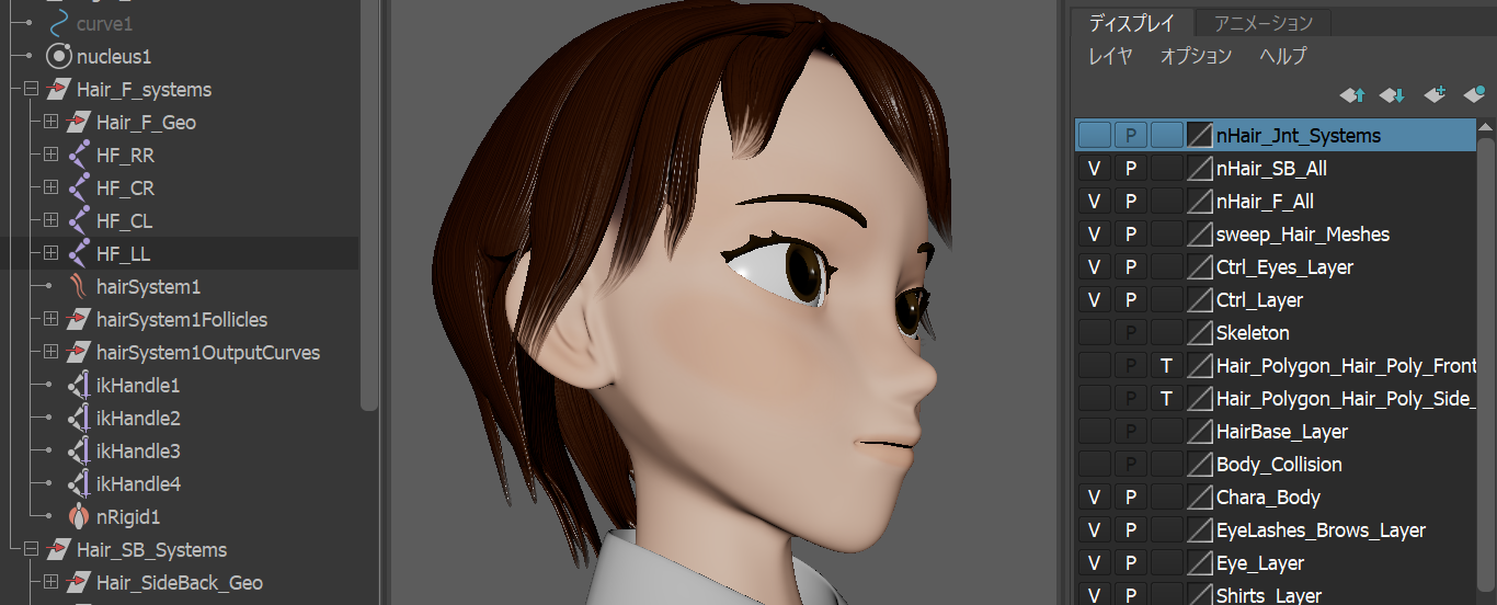 Mayaのダイナミクス エフェクトnHairを使って、アニメキャラのポリゴンヘアを揺らします。