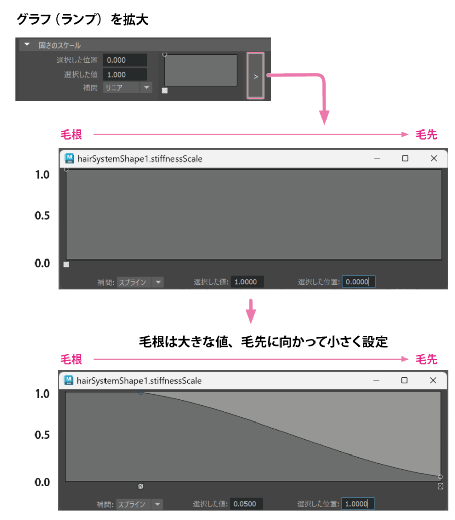 根元から毛先へ向かって値を変化させたいときにグラフを設定します。
