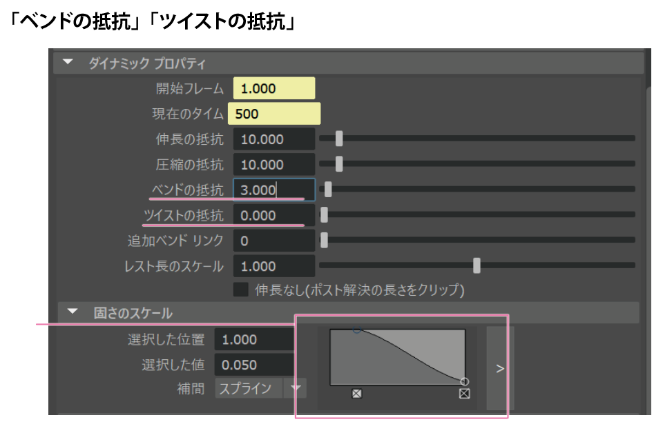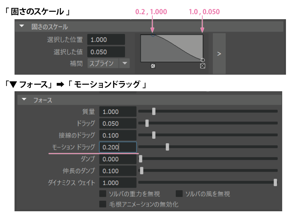 さらに、「▼ フォース」項目の「モーション ドラッグ」の値もこの「固さのスケール」グラフ値の影響を受けます。